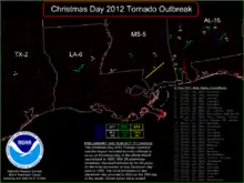 - "Christmas Day Tornadoes of 2012". National Weather Service Office in Birmingham, Alabama. National Oceanic and Atmospheric Administration. January 1, 2013. Retrieved January 5, 2014.