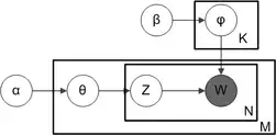 The fact that W is grayed out means that words are the only observable variables, and the other variables are latent variables. As proposed in the original paper,[3] a sparse Dirichlet prior can be used to model the topic-word distribution, following the intuition that the probability distribution over words in a topic is skewed, so that only a small set of words have high probability. The resulting model is the most widely applied variant of LDA today. The plate notation for this model is shown on the right, where denotes the number of topics and are -dimensional vectors storing the parameters of the Dirichlet-distributed topic-word distributions ( is the number of words in the vocabulary).