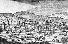 The last named is taken to be the actual "Lauterecken comital line", which characterized the town with the building of two castles, whose appearance is preserved in Matthäus Merian's engraving from about 1650. Thus, from 1543 to 1694, Lauterecken was the residence town of the sideline of Palatinate-Veldenz-Lauterecken. In 1689, however, the town and castles were destroyed. When Count Gerlach I founded the original County of Veldenz, Lauterecken had evidently outstripped the neighbouring village of Medard. Even before 1350 (likely in 1349), Lauterecken had been raised to town. In the latter half of the 14th century, the fortifications sprang up with three gates (Untertor or "Lower Gate", Bergtor or "Mountain Gate", Obertor or "Upper Gate") and five towers, of which three stood near the gravely endangered Lower Gate and two others at corners in the defensive wall (these two can be seen in the Merian engraving). Any attempt by historians to describe a castle integrated into the town fortifications at this early time has come up against considerable difficulties. There can, however, be no doubt that there was a castle complex either within the town or nearby that served a mainly defensive purpose rather than that of simply representing the local lords. In 1384, it was said that the work on the original town fortifications was completed. At the so-called brotherly partition in 1387, Count Friedrich of Veldenz received the town of Lauterecken with its castle and Burgmannen along with a few outlying villages, while Medard passed as a village in the Amt of Odenbach to Count Heinrich. In 1393, Count Friedrich III founded an actual Amt of Lauterecken, which he expanded by adding to the hitherto small region the Ämter of Nerzweiler, Reichenbach and Bosenbach. Belonging to this new Amt were the following places: Albersbach, Aschbach, Bettenhausen, Bosenbach, Eßweiler, Föckelberg, Fockenberg, Gimsbach, Hinzweiler, Hundheim, Jettenbach, Kollweiler, Lauterecken, Limbach, Lohnweiler, Matzenbach, Miesenbach, Mühlbach, Nerzweiler, Neunkirchen am Potzberg, Niedersteegen, Niederstaufenbach, Obermohr, Oberstaufenbach, Obersteegen, Oberweiler im Tal, Reichenbach, Reichenbachstegen, Rothselberg, Rutsweiler am Glan, Schrollbach, Theißberg, Wiesweiler and other places that now no longer exist. In 1444, the County of Veldenz met its end when Count Friedrich III of Veldenz died without a male heir. His daughter Anna wed King Ruprecht's son Count Palatine Stephan. By uniting his own Palatine holdings with the now otherwise heirless County of Veldenz – his wife had inherited the county, but not her father's title – and by redeeming the hitherto pledged County of Zweibrücken, Stephan founded a new County Palatine, as whose comital residence he chose the town of Zweibrücken: the County Palatine Zweibrücken – later a Duchy.[6]