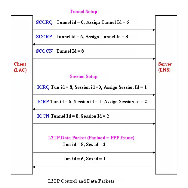 At the time of setup of L2TP connection, many control packets are exchanged between server and client to establish tunnel and session for each direction. One peer requests the other peer to assign a specific tunnel and session id through these control packets. Then using this tunnel and session id, data packets are exchanged with the compressed PPP frames as payload.