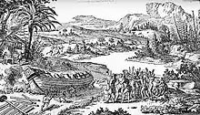 La Salle's men first had to build their lodging and then guard against the Iroquois who were hostile to this invasion of their ancient homeland.[4] La Salle had instructed Hennepin and La Motte to go 75 miles (120 km) into wilderness in knee-deep snow on an embassy to the great village of the Seneca tribe, bringing gifts and promises in order to obtain their good will to build "the big canoe" (Le Griffon), but many tribal members did not approve.[1][4] Beginning on Christmas Day, 1678, La Motte and Hennepin together with four of their men, went by snowshoe to a prominent Seneca chief who resided at Tagarondies[notes 2] a village about 75 miles (120 km) east of Niagara[notes 3] and about 20 miles (32 km) south of Lake Ontario.[9] They wished to secure a reliable truce lest the natives interfere with their projects. Those left behind proceeded with needed building projects. Negotiations with the Senecas were only moderately successful, so when they left the village they still wondered if the natives would permit them to finish their project. They reached Niagara again on 14 January.[8]