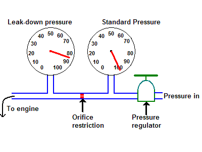 A leak-down tester[2] is essentially a miniature flow meter similar in concept to an air flow bench. The measuring element is the restriction orifice and the leakage in the engine is compared to the flow of this orifice. There will be a pressure drop across the orifice and another across any points of leakage in the engine. Since the meter and engine are connected in series, the flow is the same across both. (For example: If the meter was unconnected so that all the air escapes then the reading would be 0, or 100% leakage. Conversely, if there is no leakage there will be no pressure drop across either the orifice or the leak, giving a reading of 100, or 0% leakage).