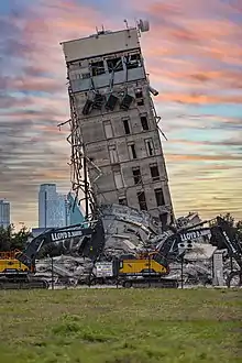 The "Leaning Tower of Dallas" was the core of an 11-story building in Dallas, Texas that unexpectedly remained standing and slightly leaning after the demolition of the building it was part of. On February 16, 2020, Lloyd D. Nabors Demolition company demolished it to make way for a $2.5 billion mixed-use project. The building quickly became an Internet meme and a social media hotspot for selfies. People went to Dallas from all over Texas to take photos with it, much like people do when visiting the Leaning Tower of Pisa.[1]