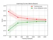 In machine learning, a learning curve (or training curve) plots the optimal value of a model's loss function for a training set against this loss function evaluated on a validation data set with same parameters as produced the optimal function. It is a tool to find out how much a machine model benefits from adding more training data and whether the estimator suffers more from a variance error or a bias error. If both the validation score and the training score converge to a value that is too low with increasing size of the training set, it will not benefit much from more training data.[1]