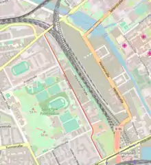 The Lehrter Straße (also: Lehrter Strasse, Lehrterstraße, and Lehrterstrasse) is a residential street in Moabit, a sub district of Mitte, one of Berlin's 12 boroughs of which the borders were redefined following the fall of the Berlin wall. It runs for an almost completely straight length, except for a small kink shortly before its southern extremity. The street is approximately 1,500 metres long and lies in a south easterly direction from the Perleberger Strasse near the Fenn Bridge, to the west of, and parallel to the disused Lehrter railway complex which was disbanded in the 1950s. It joins the Invalidenstraße a few hundred metres from the new Berlin Hauptbahnhof (Berlin's central railway station), near the site of the former Invalidenstraße East-West Berlin Cold War checkpoint. The street consists of 75 houses numbered in horseshoe fashion. After the Invalidenstrasse intersection the traffic route continues south on Clara-Jaschk Strasse.[1]