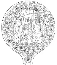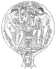 Leinth is an Etruscan deity. Within Etruscan iconography, it is difficult to distinguish mortals from divine figures without inscriptions. Inscriptions to the god Leinth have only been identified on two bronze mirrors and a single fragment of ceramic, found within an artisan’s zone on an Etruscan site in Italy. It is difficult, with such little evidence, to determine what may seem to be even the most rudimentary qualities of the deity, because the Etruscans did not consistently assign specific genders or attributes to their gods.[1] Leinth appears both as a male and a female on two different bronze mirrors, and aside from the inscription, there seem to be no distinguishing traits to connect the figures.