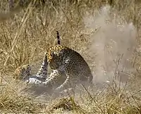 In Kruger National Park, most leopards tend to keep 1 km (1⁄2 mi) apart.[29] Males interact with their partners and cubs at times, and exceptionally this can extend beyond to two generations.[101][102] Aggressive encounters are rare, typically limited to defending territories from intruders.[23] In a South African reserve, a male was wounded in a male–male territorial battle over a carcass.[103]