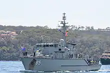 The Australian ships, which are referred to as the Huon class, have a slightly greater displacement and draft than the Gaetas.[10] The ships use a GEC-Marconi Type 2093 sonar, two SUTEC Double Eagle remote mine disposal vehicles, and are armed with a 30 mm DC30B gun.[10] The ships have a crew of 36 (including 6 officers), with further accommodation for 13 more, including 6 divers.[10] The class entered service between 1998 and 2002 and is based at HMAS Waterhen in Sydney.[10]