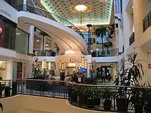 The building was gutted and renovated at a cost of $140 million and converted to a mixed-use complex with a shopping mall in the lower levels and basement, connected to the Underground City, and offices above. It reopened in 1988[5] as Les Cours Mont-Royal. The only interior remnant of the original hotel is the original lobby, which contains a huge chandelier taken from the Monte Carlo casino. The shopping area is organized around four large courts, hence the French name "Les Cours". Under the main skylight there are six bird-human sculptures by the Inuit artist David Ruben Piqtoukun.