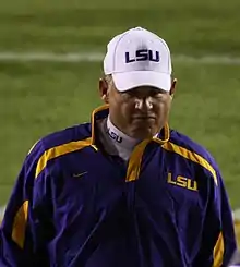 Leslie Edwin Miles (born November 10, 1953) is an American football coach who is the head football coach at the University of Kansas.[1] His head coaching career began with the Oklahoma State Cowboys, where he coached from 2001 to 2004. Following that, he coached LSU from 2005 to 2016. Miles is nicknamed "The Hat" for his signature white cap, as well as "The Mad Hatter" for his eccentricities and play-calling habits.[2] Prior to being a head coach, he was an assistant coach at Oklahoma State as well as at the University of Michigan, the University of Colorado at Boulder, and with the Dallas Cowboys of the National Football League (NFL). Miles led the 2007 LSU Tigers football team to a win in the BCS National Championship Game, defeating Ohio State.