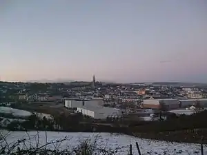 Letterkenny began as a market town at the start of the 17th century, during the Plantation of Ulster. A castle once stood near where the Cathedral of St Eunan and St Columba, County Donegal's only Catholic cathedral, stands today. Letterkenny Castle, built in 1625, was located south of Mt Southwell on Castle Street. County Donegal's premier third-level institution, the Letterkenny Institute of Technology (LYIT), is located in the town, as are St Eunan's College, Highland Radio, and a Hindu temple.[6] Letterkenny was also the original home of Oatfield Sweet Factory, a confectionery manufacturer; the factory closed and was demolished in 2014.[7] In 1798, Theobald Wolfe Tone was arrested at Laird's Hotel in the town.[8] In 2015, Letterkenny was judged as the tidiest town in Ireland.[9]