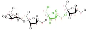 Levan is a naturally occurring fructan present in many plants and microorganism species.[1] The original discovery of levan began through research interests in a traditional Japanese dish known as natto.[2] Natto was known to be a sort of superfood which promoted health and longevity in Japan during the late 1800s.[2] In 1881, Lippmann first discovered "lävulan" (levan) as the remaining gum from molasses produced in the sugar beet companies.[3] Later on in 1901, Greig-Smith coined the name “levan” based on the levorotatory properties of this substance in polarized light. This polymer is made up of fructose, a monosaccharide sugar, connected in 2,6 beta glycosidic linkages. Levan can be in both branched and linear structures of relatively low molecular weight.[4] In the branched version, levan forms a very small, sphere-like structure.[5] This structure has basal chains of 9 units long which contain 2,1 branching, allowing for the methyl ethers to form and create a spherical shape. The ends of levan also tend to contain a glucosyl residue.[6] The branched structure of levan tends to be more stable than the linear structure.[2] However, the amount of branching and length of polymerization tends to vary among different species.[6] The shortest levan is 6-kestose, essentially a chain of two fructose molecules and a terminal glucose molecule.