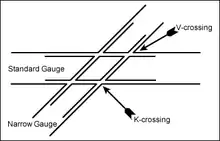 The cross-over structure is sometimes called a diamond junction or diamond crossing in reference to the diamond-shaped center. The two tracks need not necessarily be of the same gauge. A diamond crossing is also used as a component of a double junction, like the one illustrated on the right.