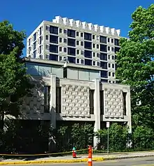 With the formation of Leverett House in 1930-31, Mather Hall, across Mill Street, was built along with the present dining hall and Master's residence. Six squash courts were also constructed, adjacent to Mather Hall. Leverett remained in that configuration until the early 1960s, when the College expanded and new Houses were added. Mather Hall became a part of Quincy House, the squash courts were lost, and the Leverett Towers were built. The Saltonstall family gave money for a new library in honor of the ten generations of Saltonstalls who had attended Harvard, and the House offices moved to the first floor of F-Tower. Shepley, Bulfinch, Richardson and Abbott designed the two-story library, as well as the two twelve-story Leverett Towers that were constructed at the same time.[1] In 1983, McKinlock was renovated, and at that time a new entrance to the dining hall was constructed.