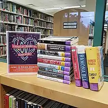 Alexander Parks and others have identified libraries as potentially important safe places for LGBTQ youth and teens, especially in the face of bullying.[29] He suggests the inclusion of LGBTQ titles in library displays or book talks to promote greater visibility. However, according to a 2005 study by Ann Curry, though many LGBTQ teens have the very similar concerns to their adult counterparts, librarians often do not answer their questions related to LGBTQ topics in a sensitive or welcoming manner.[30] Studies by Carmichael and Greenblatt have emphasized that the library is an important place for teens who are coming out to find information because of the potential anonymity it provides.[30] In his examination of public libraries in areas with large concentrations of same-sex families, Naidoo finds that many children's librarians are unaware of the LGBTQ families in their community and provide a mixed-bag of services, collections, and programs.[31]