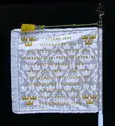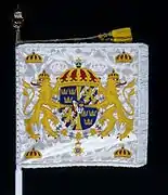The 1995 standard was drawn by Bengt Olof Kälde and embroidered by hand in insertion technique by Maj-Britt Salander/company Blå Kusten. Blazon: "On white cloth in the centre the Swedish Royal coat of arms as to the law without mantle. In each corner a royal crown proper with red lining. On the reverse battle honours (Lützen 1632, Lund 1676, Oldendorf 1633, Landskrona 1677, Wittstock 1636, Düna 1701, Leipzig 1642, Kliszow 1702, Warsaw 1656, Pultusk 1703, Fredriksodde 1658, Holovczyn 1708, Tåget över Bält 1658, Hälsingborg 1710, Halmstad 1676, Svensksund 1790) horizontally placed and in each corner three open crowns placed two and one (a legacy from the former Royal Life Regiment Dragoons, K 2), all yellow. White fringe."[13] The standard was also carried by the Life Guards Dragoon Battalion (Livgardets dragonbataljon). The standard was taken out of service on 19 March 2014 when a new was handed over by the king.[14]