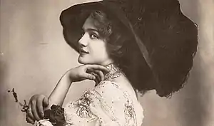 Lucile designed the costumes for Elsie in The Merry Widow (including the plumed hats that became an extraordinary fad) and thereafter used Elsie to promote her fashions, designing her personal clothes and costumes for several of her other shows. Lucile wrote, "That season was a very brilliant one, perhaps the most brilliant of the series which brought the social life of pre-war London to its peak. And just when it was at its zenith a new play was launched with a new actress, who set the whole town raving over her beauty...."[6] Elsie's image was in great demand by advertisers[8] and on postcards, and she received unsolicited gifts of great value from many male admirers (and even bequests).[1] Lucile commented, "She was absolutely indifferent to most [men] for she once told me she disliked the male character and considered that men only behaved tolerably to a woman who treated them coldly".[6] Nevertheless, Elsie became one of the most frequently photographed beauties of the Edwardian era. According to the Atlanta Constitution newspaper in America, writing in 1915: