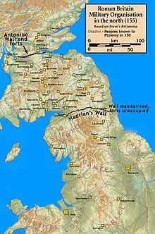 The limes in Britain (Limes Britannicus) is on the territory of the present-day United Kingdom in England, Scotland and Wales. From the 1st to the 2nd century, the Gask Ridge and the Stanegate, with their chains of Roman camps and watchtowers, marked the northern boundary of Britannia. Later the isthmuses in the north between the Firth of Forth and Firth of Clyde were guarded by the defences of the Antonine Wall and the line between the mouth of the Tyne and Solway Firth by Hadrian's Wall. The perimeter defence of Hadrian's Wall was achieved through the construction of camps (castella) on the lowlands, which were built along the most important roads in the north. Security and monitoring on the coasts in the west and southeast was achieved by camps and by chains of watchtowers or signal towers, both along the coastline and along main roads in the interior.