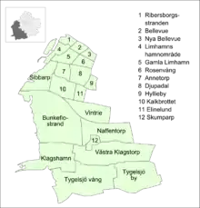 Limhamn-Bunkeflo was a city district (Swedish: stadsdel) in the west and south of Malmö Municipality, Sweden. On 1 July 2013, it was merged with Hyllie, forming Väster.[1] In 2012, Limhamn-Bunkeflo had a population of 42,646 of the municipality's 307,758.[2] The area was 5,147 hectares.[3]