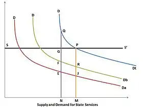 The idea of using aggregate marginal utility in the analysis of public finance was not new in Europe. Knut Wicksell was one of the most prominent economists who studied this concept, eventually arguing that no individual should be forced to pay for any activity that does not give them utility.[2] Erik Lindahl was deeply influenced by Wicksell, who was his professor and mentor, and proposed a method for financing public goods in order to show that consensus politics is possible. As people are different in nature, their preferences are different, and consensus requires each individual to pay a somewhat different tax for every service, or good that he consumes. If each person's tax price is set equal to the marginal benefits received at the ideal service level, each person is made better off by provision of the public good and may accordingly agree to have that service level provided.