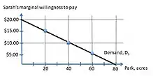 Figure 1 shows Sarah's marginal willingness to pay for a public park. For the first acre of the park, Sarah is willing to pay $20. For the 80th acre, her marginal willingness to pay has decreased down to zero.