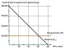 Take for example a public park, with a constant marginal cost of $15 per acre. This public park will be available to two people, Sarah and Tom.