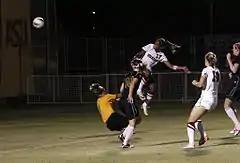 ![]() Taylor (17) heads the ball past Arizona State's goalkeeper on October 14, 2011, in Tempe, Arizona | |||