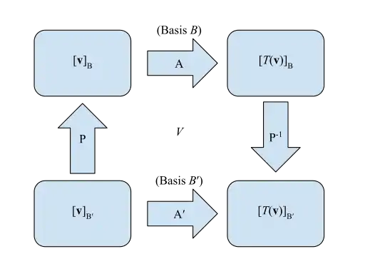 Given a linear map which is an endomorphism whose matrix is A, in the basis B of the space it transforms vector coordinates [u] as [v] = A[u]. As vectors change with the inverse of B (vectors are contravariant) its inverse transformation is [v] = B[v′].
