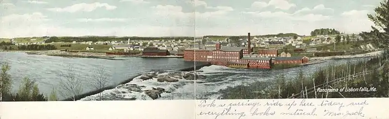 Abenaki Indians called the falls Anmecangin, meaning "much fish". The area was once part of Little River Plantation, a portion of which was incorporated in 1799 as Thompsonborough, then renamed in 1802 after Lisbon, Portugal. In 1806, Lisbon annexed the remainder of Little River Plantation. With water power from the Androscoggin River, Lisbon Falls became a small mill town.[2] Before it burned down in 1987, the Worumbo Mill was the main mill in Lisbon Falls. It had been incorporated in 1864, and was world-famous for its woolens.[3] Especially well known were its vicuna wool products, which became famous when President Eisenhower's Chief of Staff, Sherman Adams, received a vicuna sport coat as a gift from a wealthy industrialist and had to resign due to the resulting scandal. The town's primary employment was at a gypsum mill, which closed in 2009. Another large employer is Bath Iron Works, in nearby Bath, Maine.