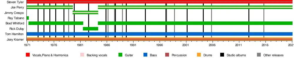 Aerosmith is an American hard rock band from Boston, Massachusetts. Formed in October 1970, the group originally included vocalist Steven Tyler, lead guitarist Joe Perry, rhythm guitarist Ray Tabano, bassist Tom Hamilton and drummer Joey Kramer, although Tabano was replaced by Brad Whitford early the following year.[1] The band's lineup has remained constant for much of its tenure, save for a five-year period between 1979 and 1984. First, Perry left the band after a show on July 28, 1979, when a confrontation between his then-wife Elyssa and Hamilton's wife Terry led to an argument between the guitarist and Tyler, resulting in the former's departure.[2] After contributing to Night in the Ruts as a session guitarist, Jimmy Crespo was invited to replace Perry in Aerosmith in October 1979.[3] Whitford also left Aerosmith in 1981 to work on a solo project with former Ted Nugent guitarist Derek St. Holmes.[4] He was replaced by Rick Dufay, before both Perry and Whitford returned to the band in the spring of 1984.[5]