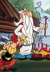 Although known for his strength-enhancing magic potion, he has many other magical and medicinal potions at his disposal, including a potion to make hair grow quickly, a potion to counteract poison, one that neutralizes a drug that would kill in a matter of days, and a potion that restores a person to full health after injury (although this potion also causes the person who takes it to lose their recent memories while also interacting badly with the magic potion). Aside from making the potion, he also acts as the village doctor and occasional teacher. Asterix (and most other villagers) will consult him whenever anything strange occurs. He does not engage normally himself in combat, whereas most of the villagers enjoy a good punch-up (even with each other). One exception is one of the stories explaining Gaulish women, using Mrs. Geriatrix as an example, in which he involves himself in a fight sparked by Impedimenta. The final cut is shown with all the male villagers and two females, Impedimenta and Bacteria included, with Getafix running to stop the fight, with a piece of fish flying towards him. His most notable brawl is when, masquerading as a cook in The Great Divide, he makes and partakes of the magic potion (passing it off as soup) to free the enslaved men from the divided village, captured by the Romans — and doing a test run on the slaves who were present — and then starts distributing slaps with obvious enjoyment.
