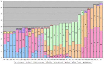 The table below shows the total number of seats won by the major political parties at each election since the recognition of political parties in British Columbia provincial elections in 1903.[6][7][12] The winning party's total is shown in bold.