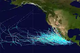 The Northeast Pacific tropical cyclone basin is defined as the region of the Pacific Ocean north of the equator and east of the International Date Line. The Northeast Pacific is further divided into two sub-basins, namely the east and central Pacific. The east Pacific runs east of the 140th meridian west, and tropical cyclones occurring there are warned upon by the National Hurricane Center, the current Regional Specialized Meteorological Center (RSMC) for that area. The central Pacific, running from the 140th meridian west to the International Date Line, currently has the Central Pacific Hurricane Center as its RSMC.[3] Tropical cyclones are generally much rarer in the central Pacific than in the east Pacific, with an average of just four to five storms forming or moving into the central Pacific compared to around 15 for the east Pacific.[4][5] All tropical cyclones recorded by past and present RSMCs of the Northeast Pacific basin since 1949 are listed in the Northeast and North Central Pacific hurricane database (HURDAT), which is compiled and maintained by the National Hurricane Center.[6][7]