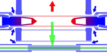 Optical pumping of a laser rod (bottom) with an arc lamp (top). Red: hot. Blue: cold. Green: light. Non-green arrows: water flow. Solid colors: metal. Light colors: fused quartz. Refs: , ,