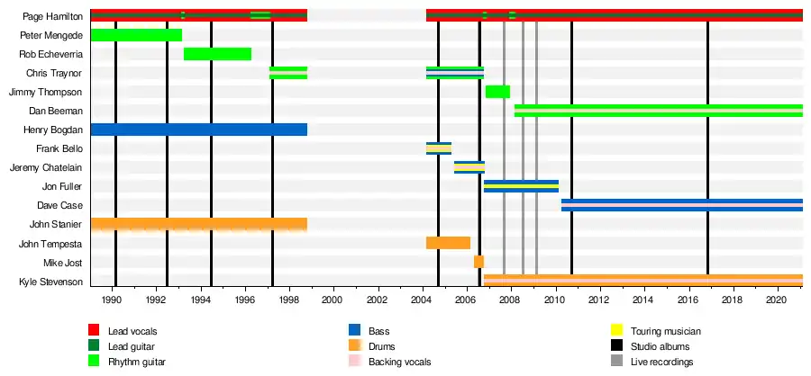 In 2003, it was announced that Helmet had reformed with bassist Rob "Blasko" Nicholson and drummer John Tempesta joining Hamilton and Traynor.[6] A spokesperson for Hamilton later debunked the news, but noted that Hamilton and Traynor were working on an unidentified project.[7] In early 2004 the Helmet reformation was officially announced, with former Anthrax bassist Frank Bello and Tempesta joining the group.[8] Bello left to return to Anthrax in early 2005, with Jeremy Chatelain taking his place for remaining tour dates.[9] Tempesta left in early 2006 to join The Cult,[10] with Mike Jost taking his place a few months later.[11] In September, more lineup changes were announced as both Traynor and Jost left the group.[12] New additions Kyle Stevenson (drums) and Jon Fuller (bass) were announced the following month, which also marked Chatelain's departure.[13] Jimmy Thompson took Traynor's place later, although only remained with the band until late 2007 before being replaced by Dan Beeman the following February.[14]