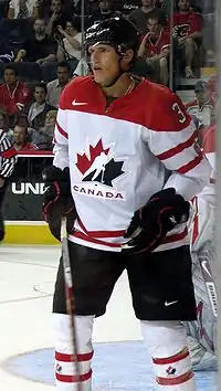 Since 1977, Canada has participated in every tournament, sending 673 players: 64 goaltenders and 609 skaters (forwards and defencemen). During this period, Canadian teams have won 29 medals: 16 gold, eight silver and five bronze. Canadian cities have hosted the tournament a combined 11 times, more than any other nation.[5] Because of the age restrictions, the majority of players have participated in only one tournament. However, 142 players (131 skaters, 11 goaltenders) have played in two tournaments. Seven players—Jason Botterill, Jay Bouwmeester, Ryan Ellis, Trevor Kidd, Martin Lapointe, Eric Lindros and Jason Spezza—have played in three tournaments. As of 2015, 513 players (464 skaters and 49 goaltenders), or 76.3% of players, have won at least one medal. Of that number, 298 (29 goaltenders and 269 skaters), or 44.3% of all players, have won at least one gold medal. Forty-four players (41 skaters and 3 goaltenders), or 6.5%, have won two or more gold medals. Jason Botterill is the only Canadian player to win three gold medals (1994–1996), while three other players have also won three medals: Jason Spezza and Jay Bouwmeester (both 2000–2002) won two bronze and one silver, while Ryan Ellis (2009–2011) won a gold and two silvers. Eric Lindros, who scored 12 goals and 19 assists for a total of 31 points over three tournaments (1990–1992), is Canada's all-time assists and points leader in the tournament.[11] Jordan Eberle, who played in the 2009 and 2010 tournaments, is Canada's all-time leading goal scorer, with 14 goals.[12]
