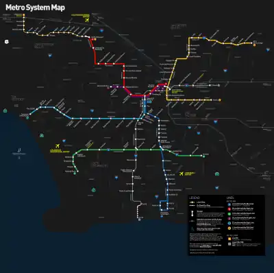 The Los Angeles Metro Rail is an urban rail transit system in Los Angeles County, California, operated by the Los Angeles County Metropolitan Transportation Authority (LACMTA or Metro). The system includes 93 metro stations with two rapid transit lines and four light rail lines, covering 98 miles (158 km) of route service.[1] In 2019, the Metro Rail system served an average 295,889 passengers each weekday, totaling 93.2 million passengers in the calendar year.[2] Metro Rail is one of the largest rapid transit and light rail systems in the United States by ridership.[3] The system is complemented by two Metro Busway bus rapid transit lines.