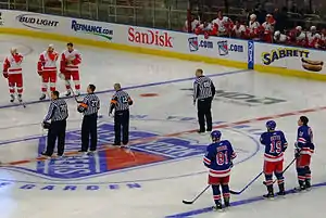 In ice hockey, an official is responsible for enforcing the rules and maintaining order. On-ice officials are present on the ice during the game, and traditionally wear a shirt with black and white vertical stripes. The National Hockey League (NHL) currently employs four on-ice officials in each game—two referees and two linesmen. Referees are identified by their red or orange armbands. They are responsible for the general supervision of the game, assess penalties, and conduct face-offs at the beginning of each period and after a goal is scored. When play is stopped for another reason, the face-offs are conducted by the linesmen. The linesmen are primarily responsible for violations involving the centre line and blue lines, such as icing and offside infractions.
