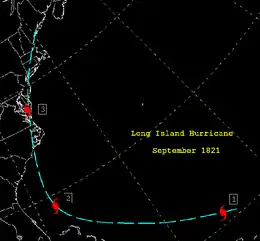 - September 3, 1821 — The 1821 Norfolk and Long Island hurricane results in severe damage on Long Island and is accompanied by storm surge of 13 feet (4 m). High wind causes a ship to crash on Long Island killing 17 people.[7]