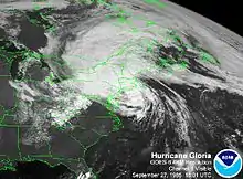 - September 27, 1985 — Hurricane Gloria makes landfall on Long Island as a Category 2 hurricane. Wind gusts of up to 100 mph (135 km/h) and 3.4 inches (86 mm) of rain [55] contribute to $300 million (1985 USD, $591 million 2007 USD) in damage, and one fatality.[56] In addition, 48 homes on Long Island were destroyed, and hundreds more were damaged.[56]