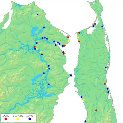 According to the Russian Census of 2002 most Nivkhs have lived in following districts:[1] Ulchsky, Nikolayevsky of Khabarovsk Krai and Alexandrovsk-Sakhalinsky, Nogliksky, Okhinsky of Sakhalin Oblast. Some Nivkhs live outside of their native area in big citites of Khabarovsk, Yuzhno-Sakhalinsk and Poronaysk.