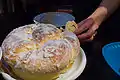 Meat dish | A beef roulade often prepared for special occasions it consists of thin sheets of cooked eggs and marinated beef layered one on top of the other, then wrapped and tied around carrots, celery, cheese, pork fat, and sausage. This is then cooked in seasoned tomato sauce. | |