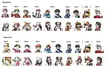 The protagonists of the main Pokémon video games series. The upper row is their image of the remake or enhanced versions and the lower row is their original image.