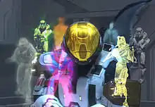 Delta often appears as a holographic miniature soldier beside York's head; the green glow was created in-game by using the plasma pistol according to Burnie Burns.[7] However, Delta can modify his appearance to match the situation. When threatened by Tex, he went "on alert" and his glow turned red. Later, in a ploy to trick Wyoming, Delta managed to change his size and color, and appears as a hologram of Tex.