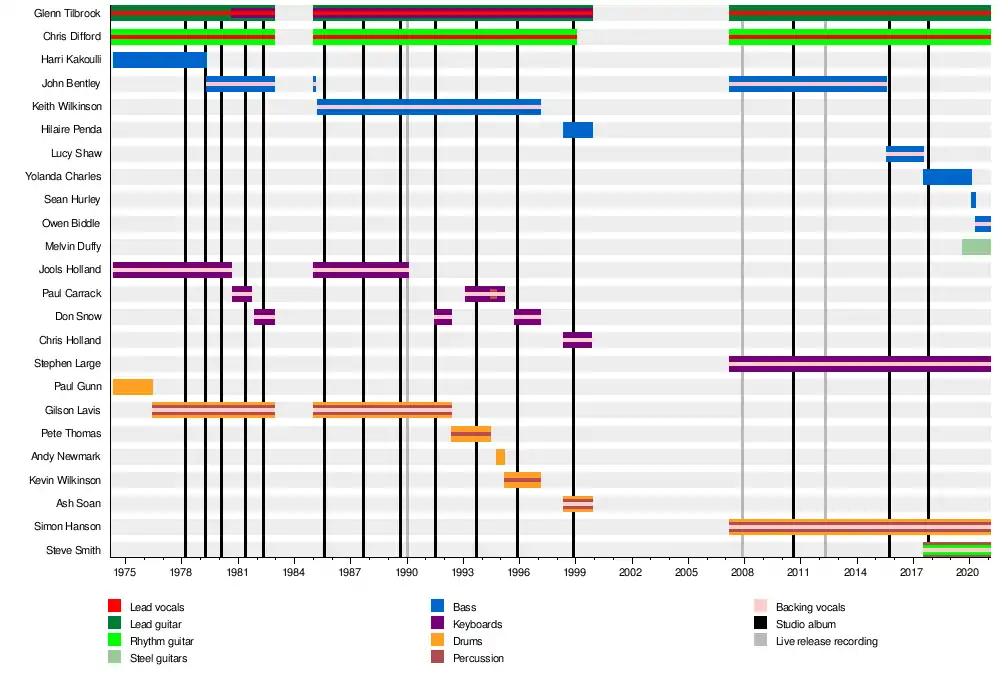 After the release and promotion of their eleventh studio album, Squeeze announced in July 2017 that Shaw had been replaced by Yolanda Charles, and that Steve Smith had joined on percussion, guitar and vocals.[34] Both new members debuted on The Knowledge that year.[3] The group became a seven-piece for the first time in August 2019, when steel guitarist Melvin Duffy – who had performed with the band for several years as a backup member – joined officially.[35] Sean Hurley replaced Charles in February 2020,[36] who was followed by Owen Biddle in April.[37]