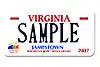| License plate | The plate has a completely white background. Virginia is written in red at the top. "400th Anniversary" is written at the bottom with a picture of a ship separating the words. 1607 is written on the left and 2007 is written on the right. | 2013[5][6] | ![]() [C] |