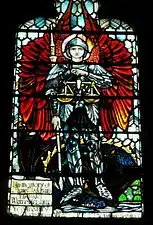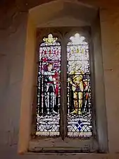 The window has three lights and a Saint is depicted in each. St George is portrayed in the left hand light, St Michael in the central light and St Louis in the light to the right. The inscription is beneath the figures and sits across the three lights. The window was unveiled on 4 March 1916 by the Bishop of Derby.[12] |