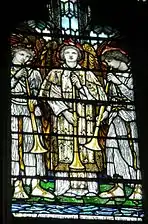 The window consists of three lights. The window was presented in 1920 by James, Fourth Marquess of Salisbury, in memory of his three nephews. Their father was Lord William Cecil, then Bishop of Exeter who had previously been rector at Hatfield. The three angels in the work represent "Trial and Sacrifice" (crown of thorns), "Victory and Triumph" (resurrection and torch) and "Christian Duty" (baptism of the infant). The red seraphim in the tracery above represents "Divine Love" and the blue seraphim represents "Divine Wisdom". [17] |