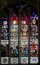 The window was unveiled on 11 November 1921 by Lieutenant-Colonel A.D.Legard and dedicated by the Bishop Suffragan of Hull. The four British patron saints portrayed symbolise 1) "Spiritual Victory" - St Patrick drives out the snakes 2) "National Victory" - St George slays the dragon 3) "Plenty" - St Andrew with the boy with the loaves and fishes and 4) "Plenty and Unity" - St David, the inspired preacher who united the church of his day. The lower panels show 1) the horror and destruction of war 2) the conquest of evil 3) stilling the storm and 4) a boat reaching safe harbour. The tracery above the window shows the crown of thorns, then nails and the reed, symbols of sacrifice. In the volume in The Buildings of England series which covers "Yorkshire: York and the East Riding", David Neave and Nikolaus Pevsner describe the window as "adventurous".[19] The window is the West window in the Tower.[20] |