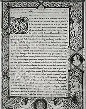 The Diocletianic Persecution started on March 31, 302, with the Roman Emperor Diocletian, in a rescript from Alexandria, ordering that the leading Manichaeans be burnt alive along with their scriptures.[27][28] On the following year, on February 23, 303, Diocletian ordered that the newly built Christian church at Nicomedia be razed, its scriptures burned, and its treasures seized.[29] Later persecutions included the burning of both the Christians themselves and of their books. As related in later Christian Hagiography, at that time the governor of Valencia offered the deacon who would become known as Saint Vincent of Saragossa to have his life spared in exchange for his consigning Scripture to the fire. Vincent refused and let himself be executed instead. In religious paintings he is often depicted holding the book whose preservation he preferred to his own life (see illustration in Saint Vincent of Saragossa page.)[30] Conversely, many other Christians, less courageous, did save their lives by giving away their Scriptures to be burned. These came to be known as Traditores (literally, "those who give away") from which the modern word "traitor" is derived.